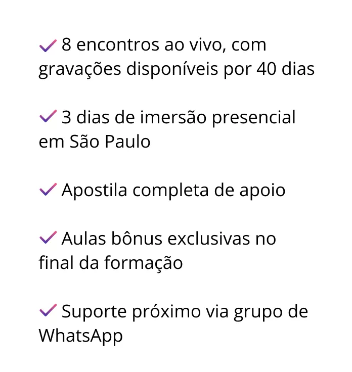 No próprio grupo do WhatsApp, você receberá o passo a passo detalhado para acessar as aulas ao vivo e também as gravações. Assim, você terá sempre à mão todas as orientações necessárias e o suporte da equipe durante toda a formação.
